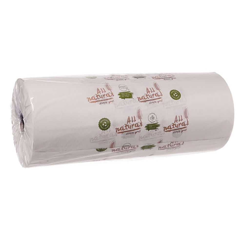 Dieses Bäckerseide Einschlagpapier in weißer Ausführung mit neutralem „All Natural“-Motiv eignet sich ideal zum hygienischen Einwickeln und Präsentieren von Backwaren. Mit einer Breite von 50 cm und als praktische Rolle mit 10 kg ist es optimal für den täglichen Einsatz in Bäckereien, Cafés und Gastronomiebetrieben.