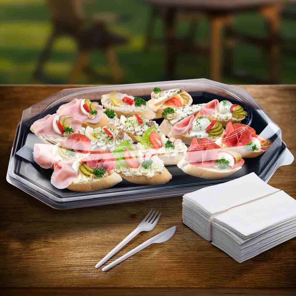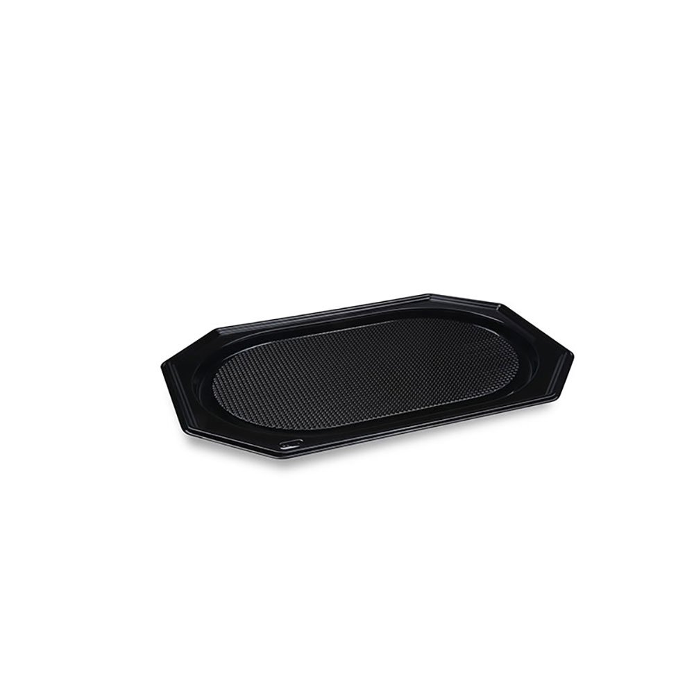 Erleben Sie erstklassige Präsentation und Funktionalität mit unserer Catering-Platte aus rPET in elegantem Schwarz. Mit großzügigen Maßen von 54 x 36 cm bietet diese ovale Platte ausreichend Platz für eine Vielzahl von Speisen, von köstlichen Vorspeisen bis hin zu großzügigen Hauptgerichten und Desserts. Hergestellt aus hochwertigem rPET (recyceltem Polyethylenterephthalat), kombiniert die Platte Umweltfreundlichkeit mit Robustheit. Das Material ist nicht nur leicht und stabil, sondern auch äußerst widerstandsfähig gegen Stöße und Kratzer. Zudem ist die Platte pflegeleicht und kann einfach gereinigt werden, was sie ideal für wiederholte Nutzung macht. Das zeitlose schwarze Design der Platte verleiht Ihrer Präsentation einen eleganten Touch und passt zu jeder Art von Veranstaltung, sei es ein geschäftliches Catering, eine private Feier oder ein Buffet. Die glatte Oberfläche sorgt dafür, dass Ihre Speisen ansprechend zur Geltung kommen und die Platte sowohl optisch als auch funktional überzeugt. Ob für große Events, spezielle Anlässe oder den täglichen Gebrauch im Gastronomiebereich – diese Catering-Platte ist die perfekte Wahl für alle, die Wert auf Qualität, Nachhaltigkeit und Stil legen. Verleihen Sie Ihrem Buffet oder Ihrer Veranstaltung eine professionelle Note mit dieser vielseitigen und eleganten Servierlösung.