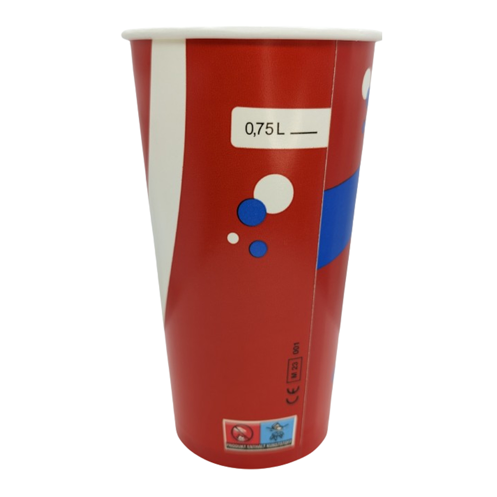 Dieser Kinobecher aus PE-beschichtetem Hartpapier (PAP) eignet sich ideal für den Einsatz in Kinos, Events oder Veranstaltungen. Mit einem Fassungsvermögen von 750 ml und einem Eichstrich bei 0,75 l ist er perfekt portioniert für Getränke jeder Art.