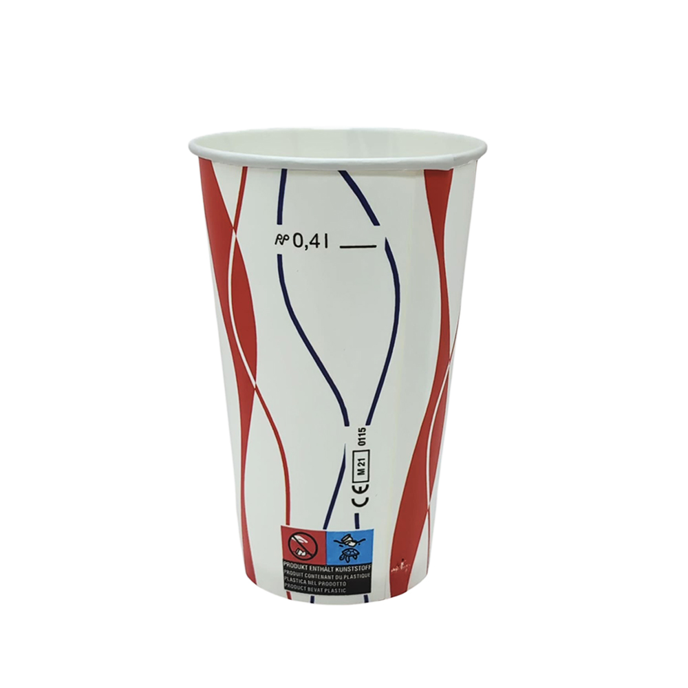 Der Pappbecher 400 ml mit Neutralmotiv Spirale ist aus stabilem Hartpapier (PAP) mit PE-Beschichtung gefertigt und bestens geeignet für Kaltgetränke. Mit einem Eichstrich bei 0,4 l bietet er sich ideal für Softdrinks, Cola oder andere Erfrischungsgetränke an. Das moderne Spiral-Design macht ihn zu einem attraktiven Begleiter in Gastronomie und To-go-Bereich.