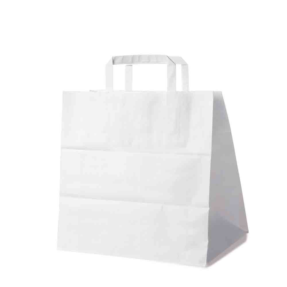 Die stabilen Papiertragetaschen in Weiß sind eine vielseitige & umweltfreundliche Verpackungslösung. Dank der robusten, geklebten Innenhenkel besitzen die Tragetaschen eine Tragfähigkeit von ca. 10 kg. Sie bestehen aus hochwertigem 80 g/qm Papier und sind damit noch langlebiger & belastbarer.