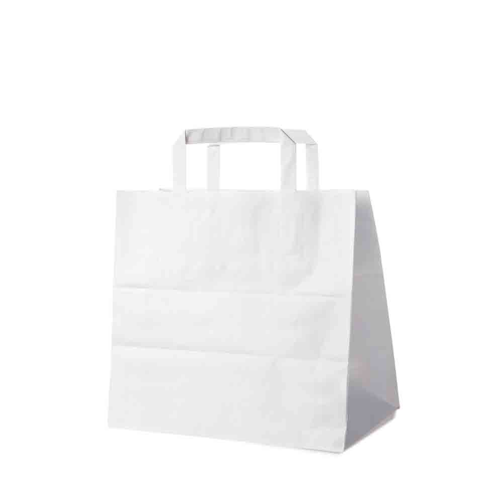 Die Papiertragetaschen in Weiß sind eine umweltfreundliche & praktische Verpackungslösung. Mit den stabilen, geklebten Innenhenkeln bieten sie eine Tragfähigkeit von ca. 10 kg. Hergestellt aus 70 g/qm Papier, sind sie robust, vielseitig und gleichzeitig umweltbewusst.